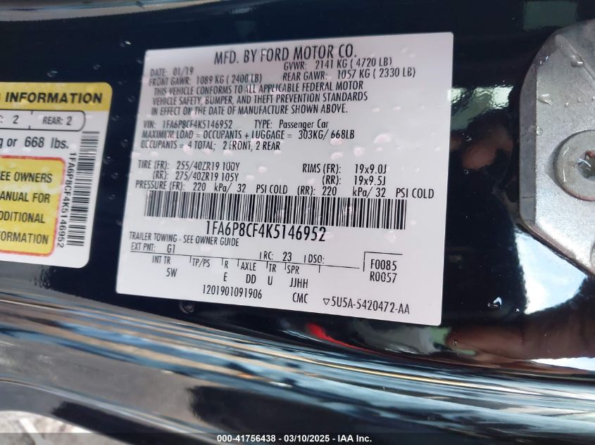 2019 FORD MUSTANG 2019 Gasoline, 5.0, Rear wheel drive, VIN - 1FA6P8CF4K5****** from the USA
