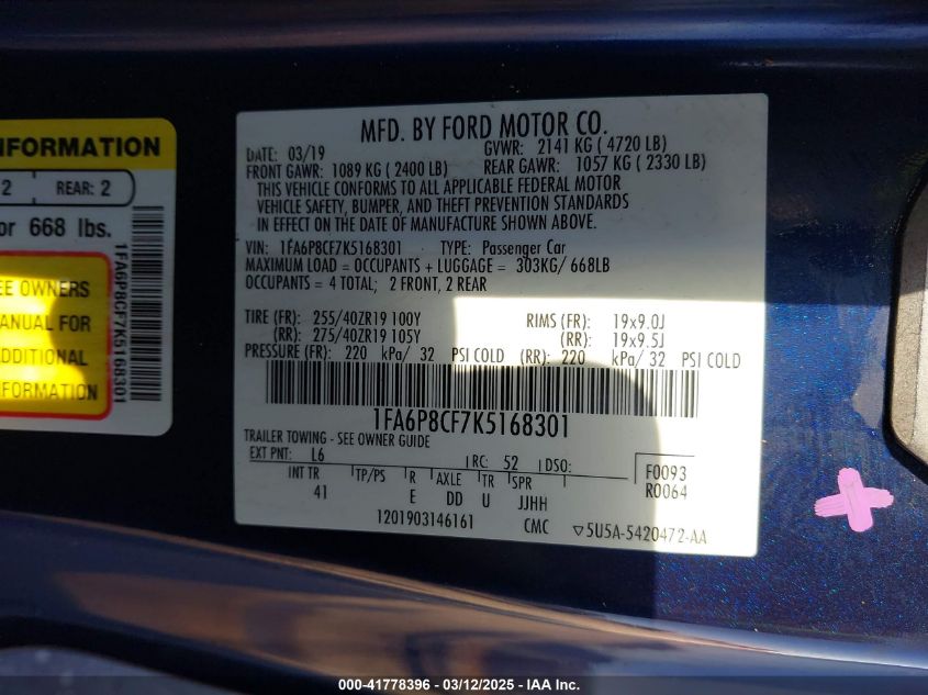 2019 FORD MUSTANG 2019 Gasoline, 5.0, Rear wheel drive, VIN - 1FA6P8CF7K5****** from the USA