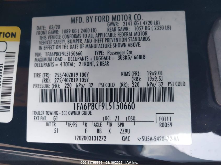 2020 FORD MUSTANG 2020 Gasoline, 5.0, Rear wheel drive, VIN - 1FA6P8CF9L5****** from the USA