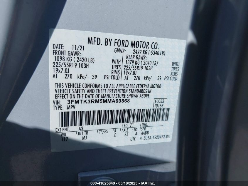 Color SilverDrive UnknownVIN 3FMTK3RM5MM******State Run & Drive VerifiedDamage Front or back AutoRIA