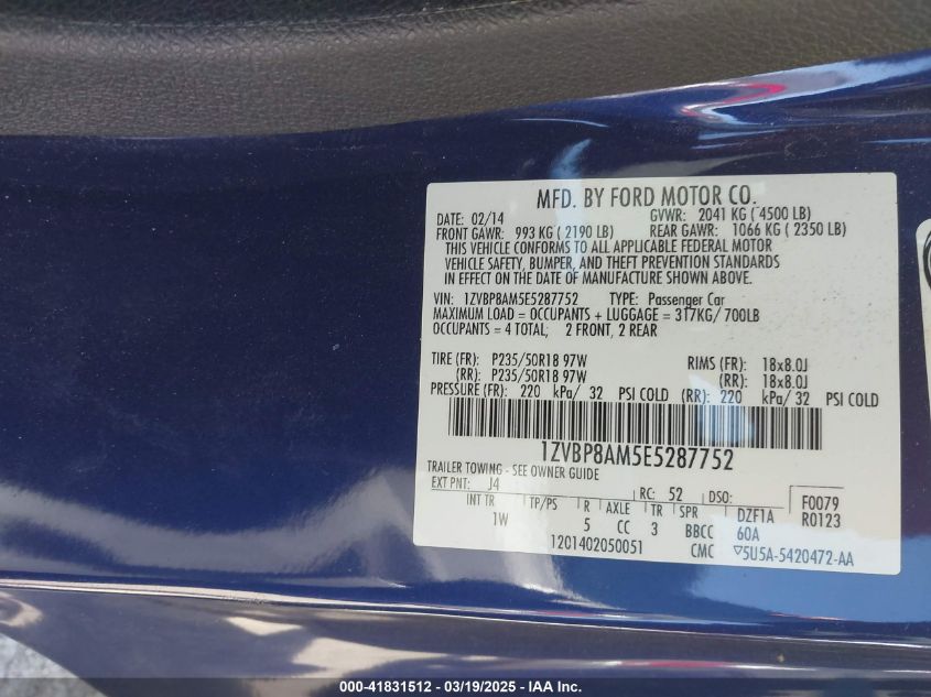 Color BlueCylinders 6Drive Rear wheel driveVIN 1ZVBP8AM5E5******State Run & Drive VerifiedDamage Front right AutoRIA