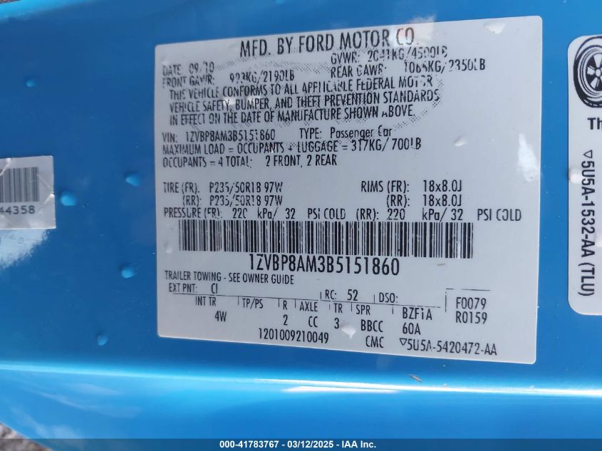 Color BlueCylinders 6Drive Rear wheel driveVIN 1ZVBP8AM3B5******State Run & Drive VerifiedDamage Front or back AutoRIA