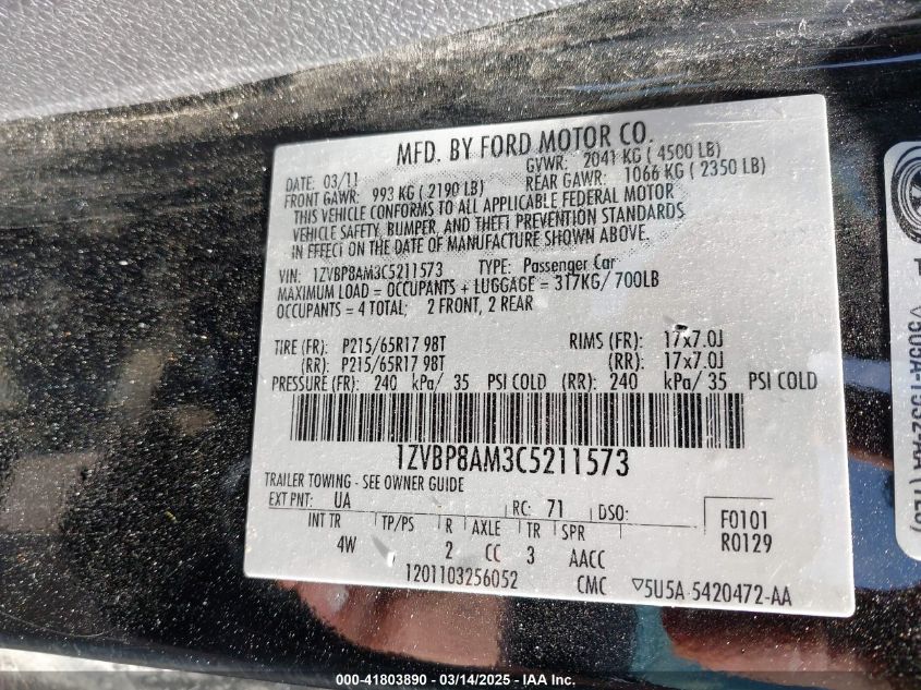 Color BlackCylinders 6Drive Rear wheel driveVIN 1ZVBP8AM3C5******State Run & Drive VerifiedDamage Front and back AutoRIA