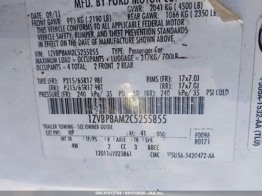 Color WhiteCylinders 6Drive Rear wheel driveVIN 1ZVBP8AM2C5******State Run & Drive VerifiedDamage From the sides AutoRIA