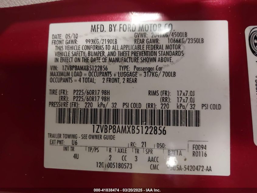 Color Cylinders 6Drive Rear wheel driveVIN 1ZVBP8AMXB5******State Run & Drive VerifiedDamage Back AutoRIA