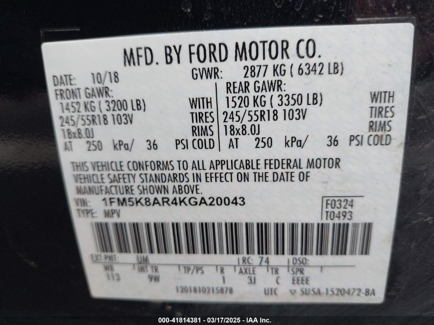 Color BlackCylinders 6Drive Full driveVIN 1FM5K8AR4KG******State Run & Drive VerifiedDamage Back