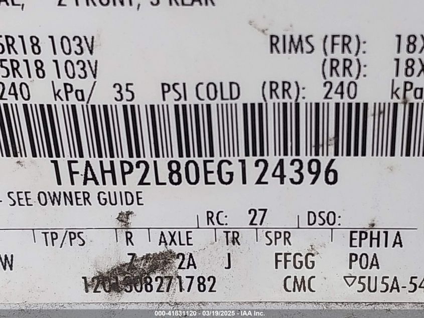 Color WhiteCylinders 6Drive Front wheel driveVIN 1FAHP2L80EG******State Run & Drive VerifiedDamage Front left