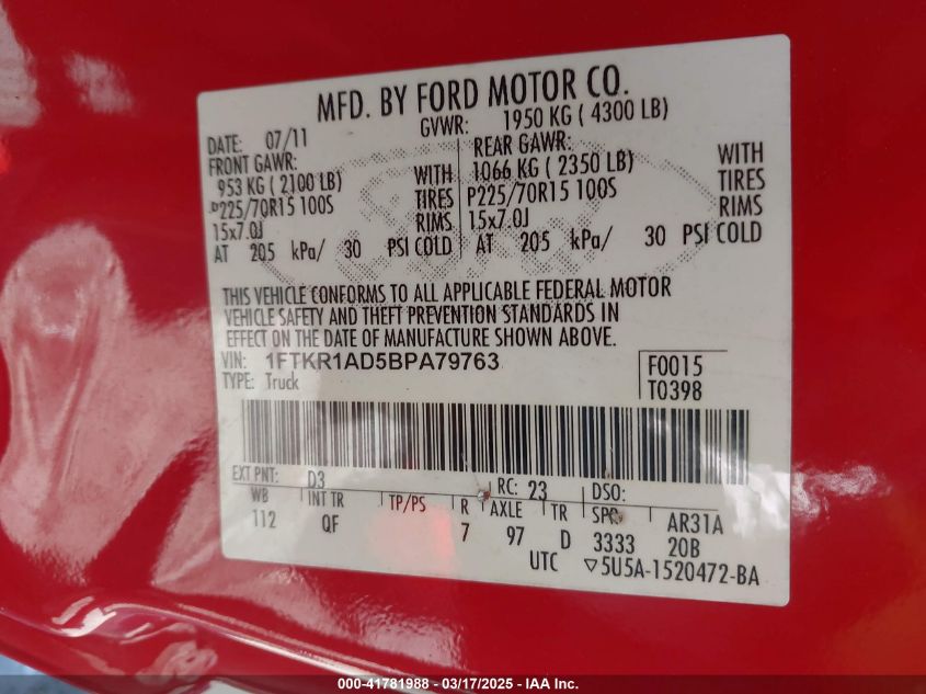 2011 FORD RANGER 2011 Gasoline, 2.3, Unknown, VIN - 1FTKR1AD5BP****** from the USA