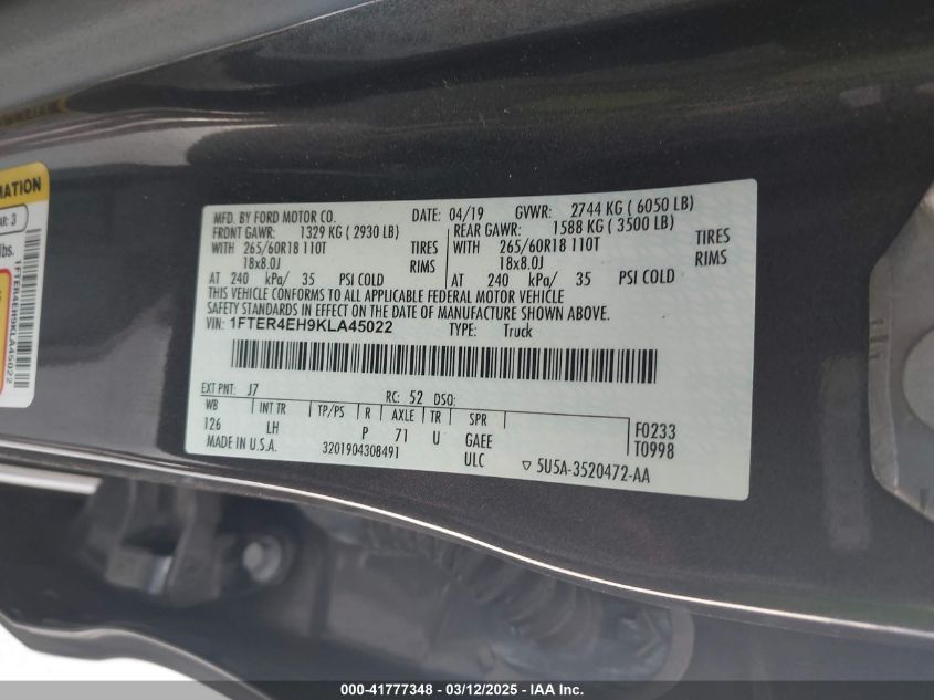 2019 FORD RANGER 2019 Gasoline, 2.3, Unknown, VIN - 1FTER4EH9KL****** from the USA