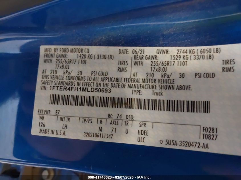 2021 FORD RANGER 2021 Gasoline, 2.3, Full drive, VIN - 1FTER4FH1ML****** from the USA