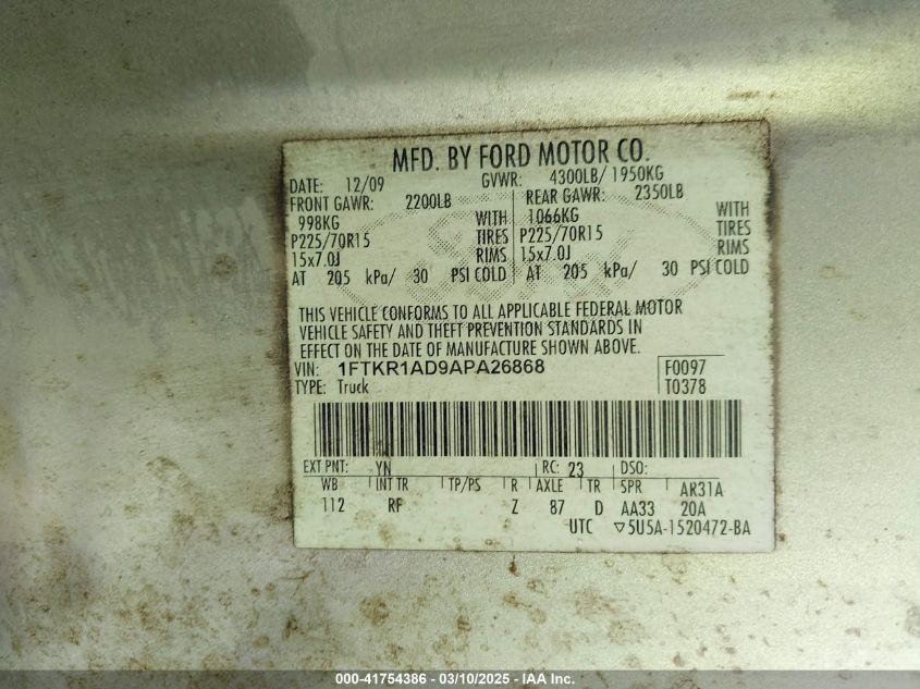 2010 FORD RANGER 2010 Gasoline, 2.3, Unknown, VIN - 1FTKR1AD9AP****** from the USA