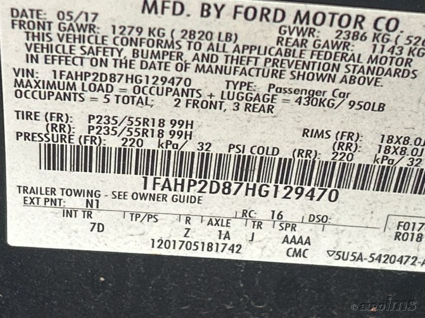 Color Cylinders 6Drive Front wheel driveVIN 1FAHP2D87HG******State Run & Drive VerifiedDamage InsignificantAuction date 2025-06-01 AutoRIA