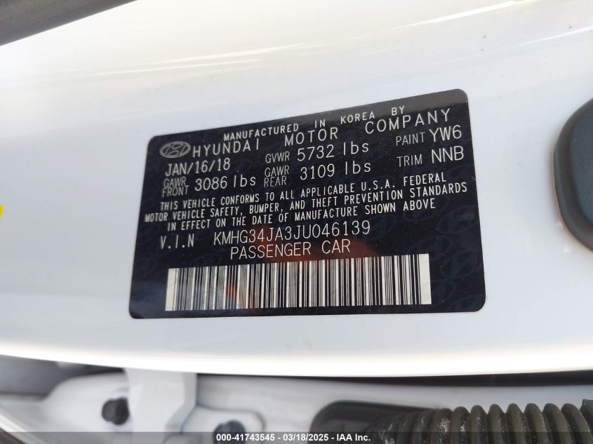 Color WhiteCylinders 6Drive Full driveVIN KMHG34JA3JU******State Run & Drive VerifiedDamage Back