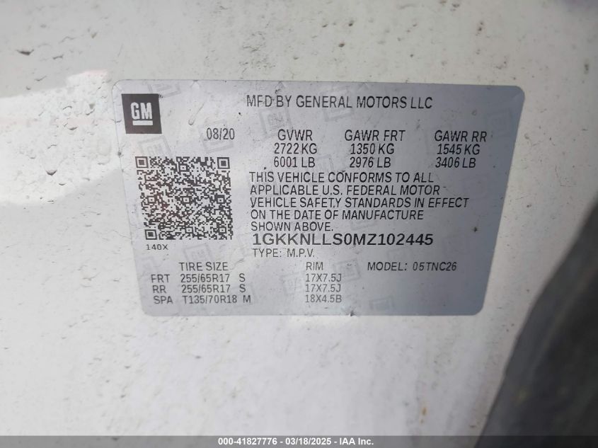 Color WhiteCylinders 6Drive Full driveVIN 1GKKNLLS0MZ******State Run & Drive VerifiedDamage Back AutoRIA