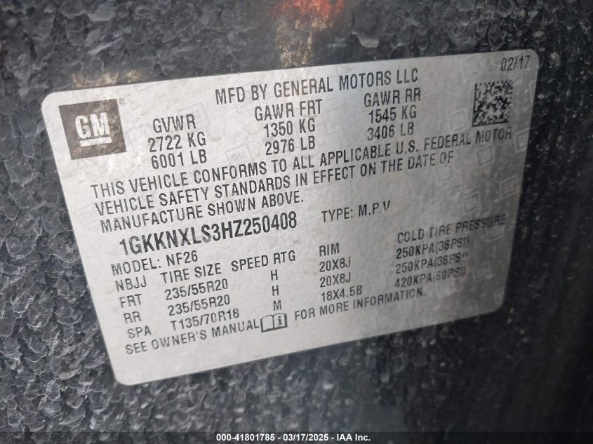Color BlackCylinders 6Drive Full driveVIN 1GKKNXLS3HZ******State Run & Drive VerifiedDamage Front right AutoRIA