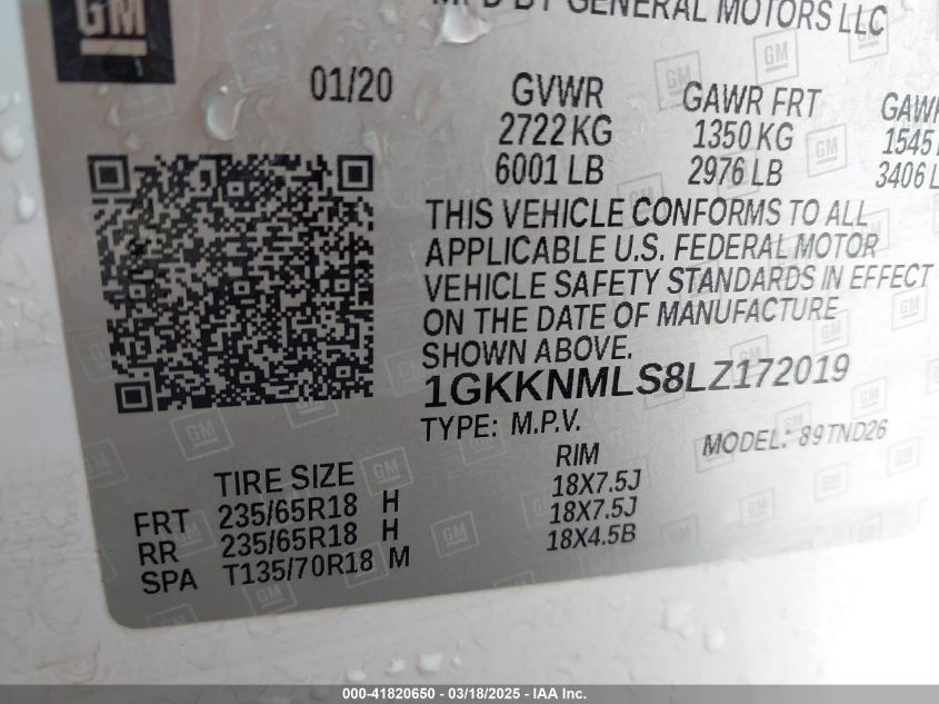 Color WhiteCylinders 6Drive Front wheel driveVIN 1GKKNMLS8LZ******State Run & Drive VerifiedDamage Front or back AutoRIA
