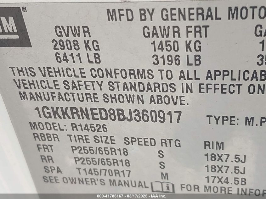 Color WhiteCylinders 6Drive Front wheel driveVIN 1GKKRNED8BJ******State Run & Drive VerifiedDamage Front or back