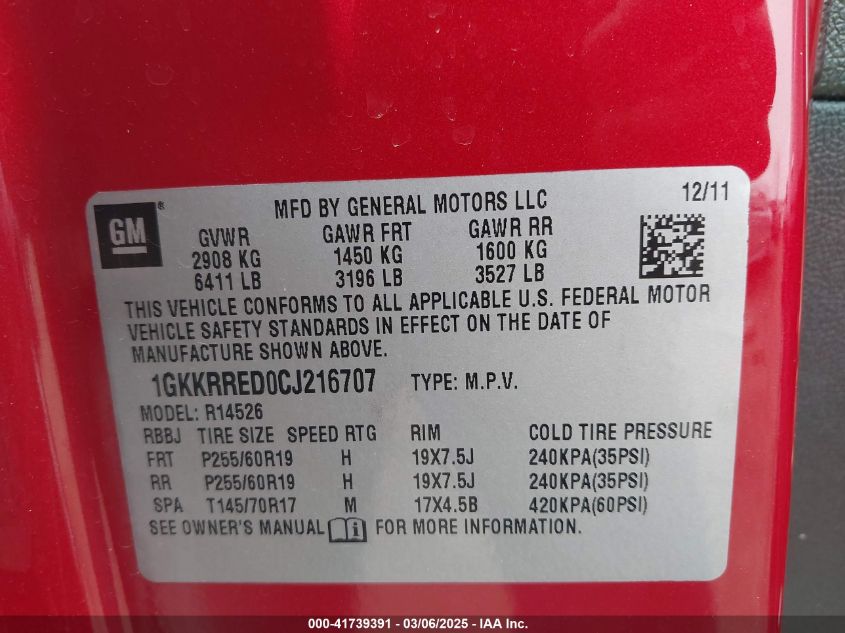 Color RedCylinders 6Drive Front wheel driveVIN 1GKKRRED0CJ******State Run & Drive VerifiedDamage Front or back AutoRIA