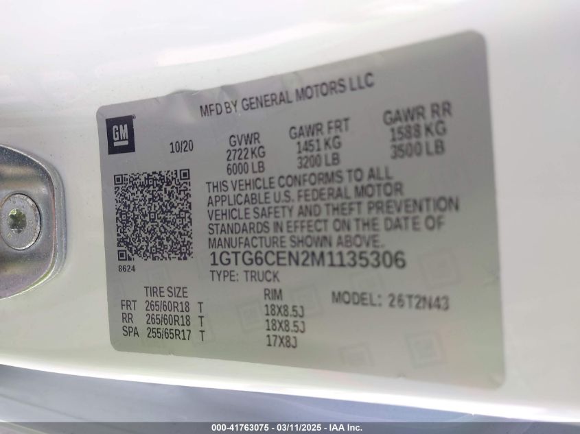 Color WhiteCylinders 6Drive Full driveVIN 1GTG6CEN2M1******State Run & Drive VerifiedDamage Front rightAuction date 2025-03-26