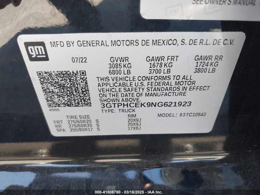 Color BlackCylinders 4Drive UnknownVIN 3GTPHCEK9NG******State Run & Drive VerifiedDamage Right side