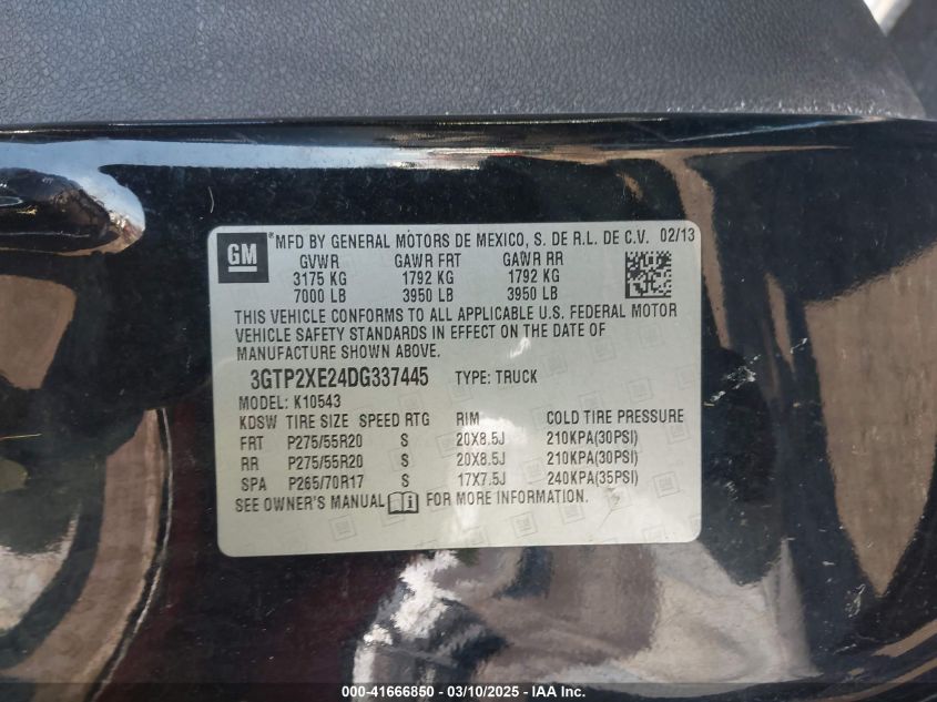 Color BlackCylinders 8Drive Full driveVIN 3GTP2XE24DG******State Run & Drive VerifiedDamage Front or backAuction date 2025-03-20