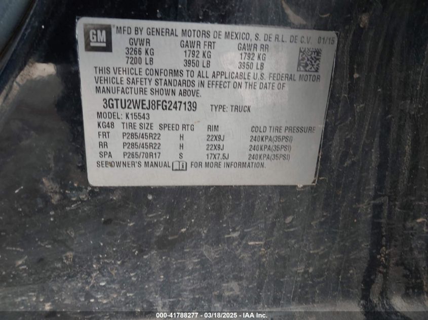 Color BrownCylinders 8Drive Full driveVIN 3GTU2WEJ8FG******State Run & Drive VerifiedDamage Back