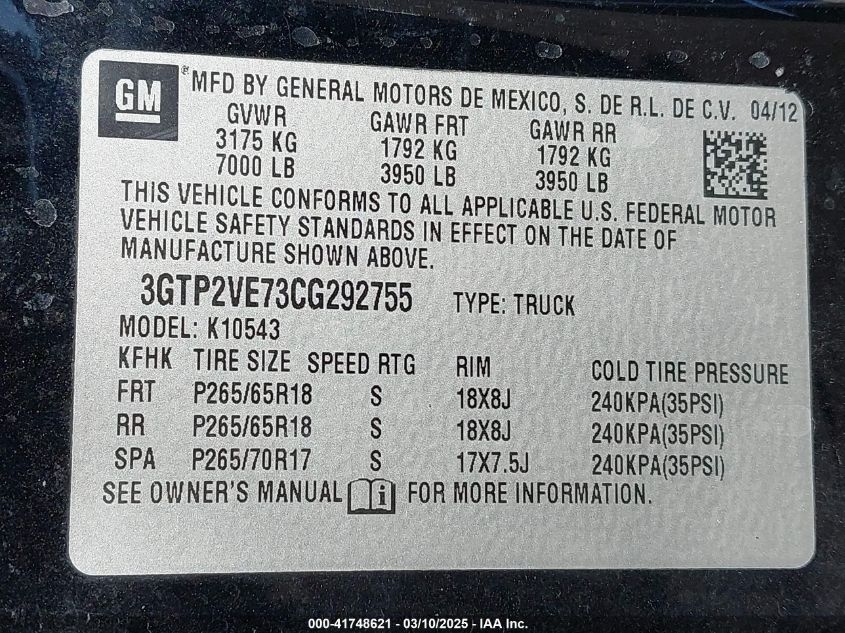 Color BlackCylinders 8Drive Full driveVIN 3GTP2VE73CG******State Run & Drive VerifiedDamage Front or backAuction date 2025-03-28