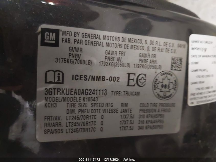 Color GrayCylinders 8Drive Full driveVIN 3GTRKUEA0AG******State Run & Drive VerifiedDamage Back