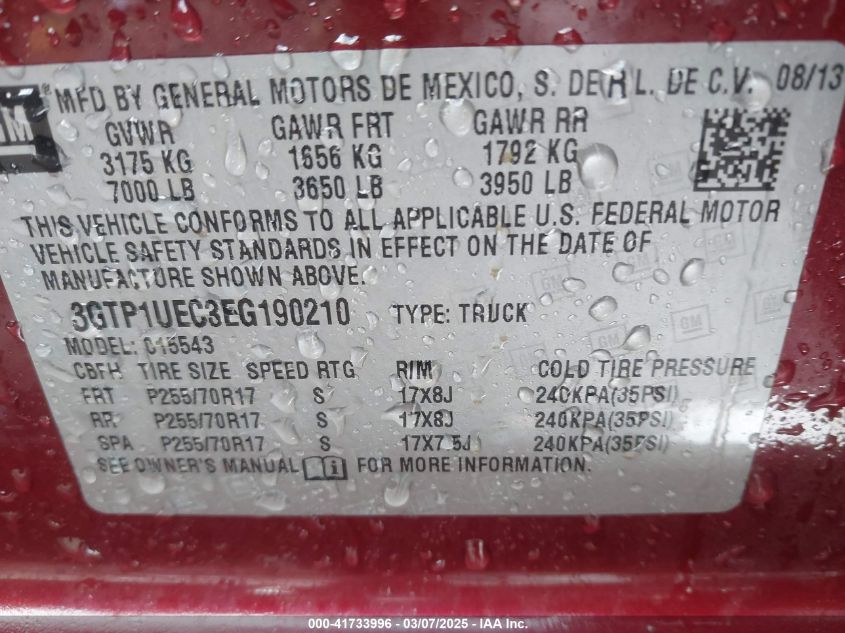 Color RedCylinders 8Drive UnknownVIN 3GTP1UEC3EG******State Run & Drive VerifiedDamage All over the car