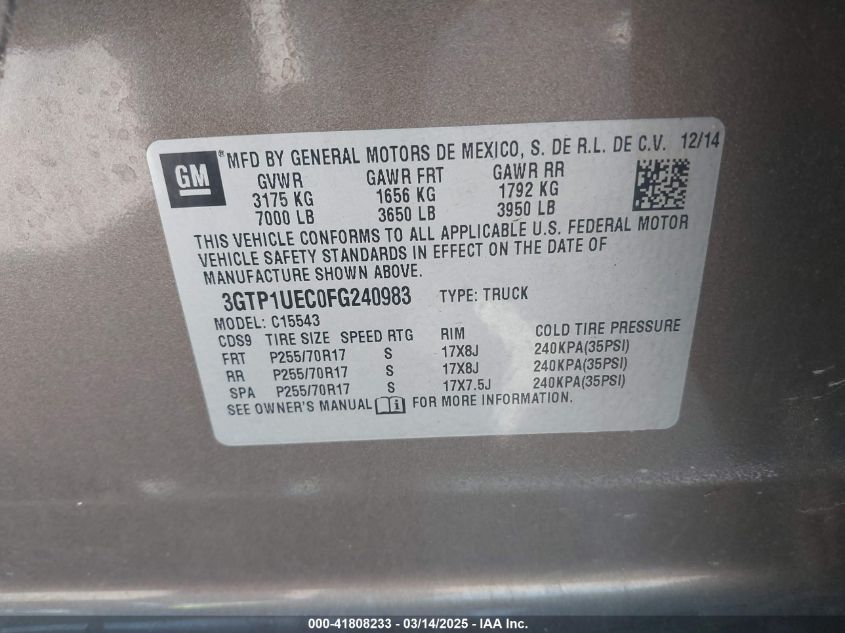Color BrownCylinders 8Drive UnknownVIN 3GTP1UEC0FG******State Run & Drive VerifiedDamage Front or back