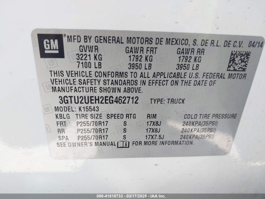 Color WhiteCylinders 6Drive Full driveVIN 3GTU2UEH2EG******State Run & Drive VerifiedDamage Front right
