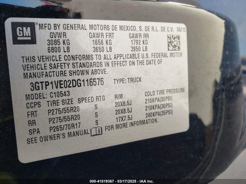 Color BlackCylinders 8Drive UnknownVIN 3GTP1VE02DG******State Run & Drive VerifiedDamage Due to bad weather
