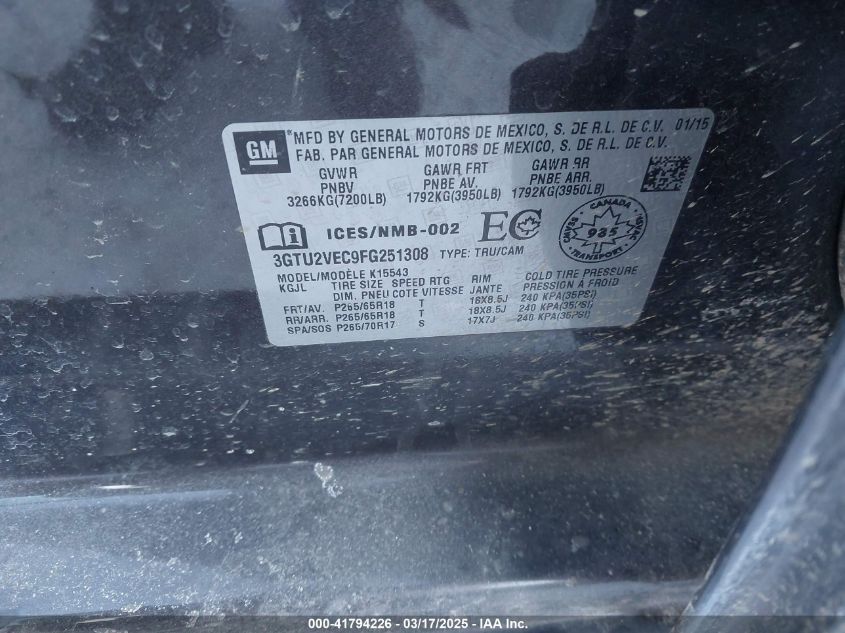 Color BlackCylinders 8Drive Full driveVIN 3GTU2VEC9FG******State Run & Drive VerifiedDamage Rear left