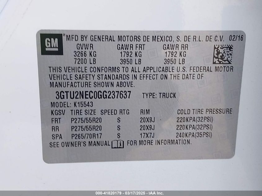 Color WhiteCylinders 8Drive Full driveVIN 3GTU2NEC0GG******State Run & Drive VerifiedDamage InsignificantAuction date 2025-03-26