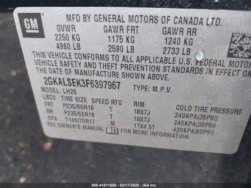 Color BlackCylinders 4Drive Front wheel driveVIN 2GKALSEK3F6******State Run & Drive VerifiedDamage MotorAuction date 2025-03-20 AutoRIA