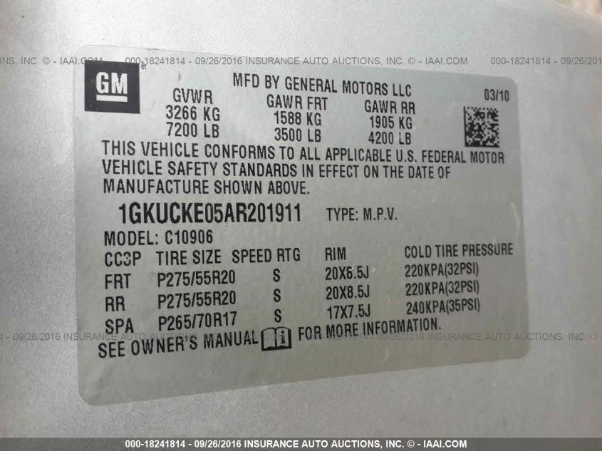 Color SilverCylinders 8Drive Rear wheel driveVIN 1GKUCKE05AR******State Run & Drive VerifiedDamage Front or back