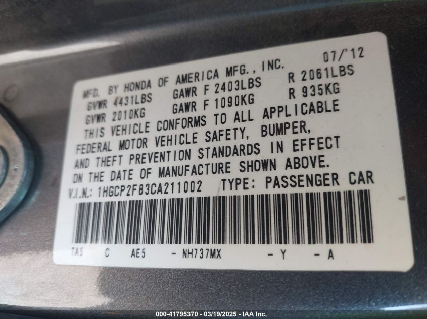 Color GrayCylinders 4Drive Front wheel driveVIN 1HGCP2F83CA******State Run & Drive VerifiedDamage Front or back AutoRIA