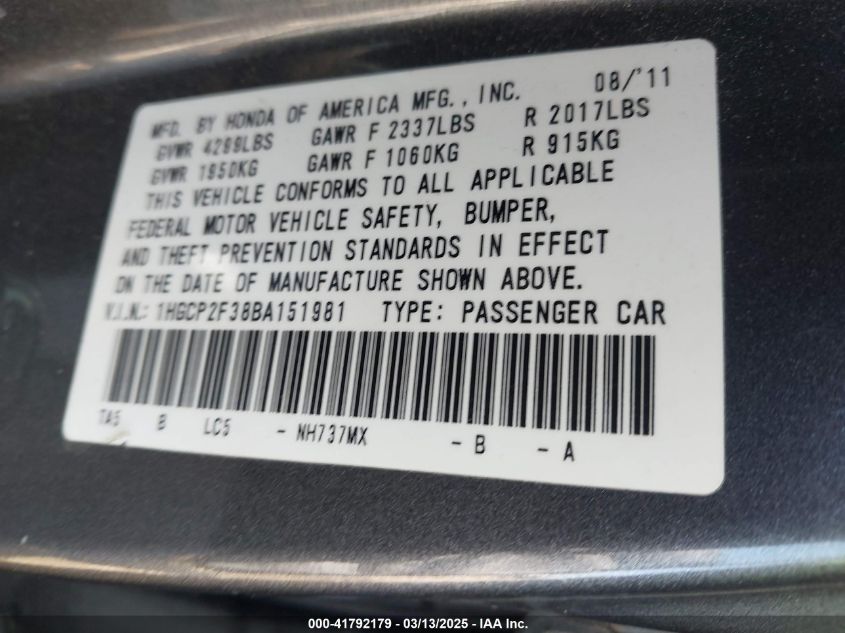 Color GrayCylinders 4Drive Front wheel driveVIN 1HGCP2F38BA******State Run & Drive VerifiedDamage Front or back AutoRIA