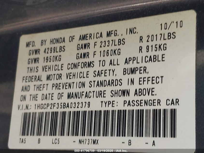 2011 HONDA ACCORD 2011 Gasoline, 2.4, Front wheel drive, VIN - 1HGCP2F35BA****** from the USA