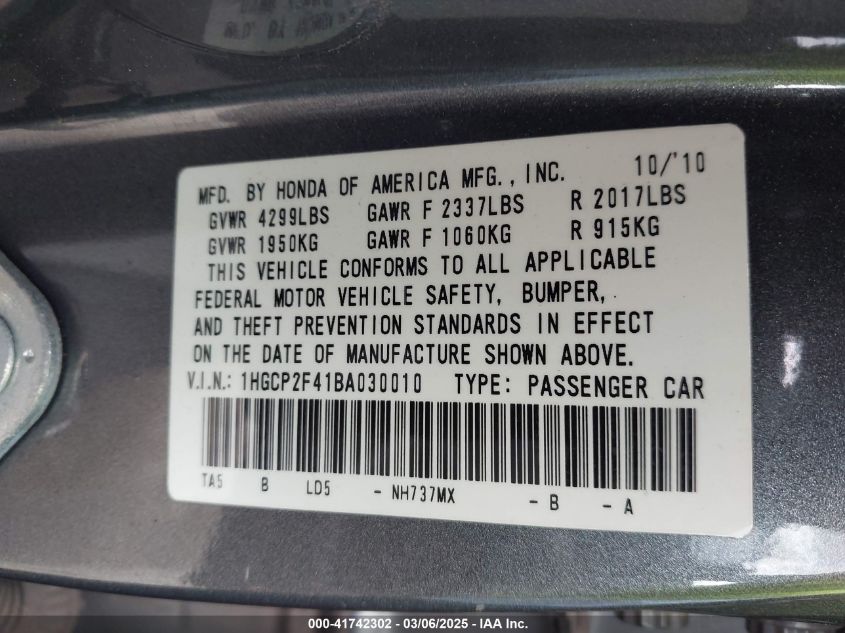 2011 HONDA ACCORD 2011 Gasoline, 2.4, Front wheel drive, VIN - 1HGCP2F41BA****** from the USA
