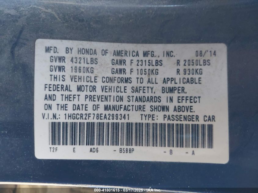 Color BlueCylinders 4Drive Front wheel driveVIN 1HGCR2F78EA******State Run & Drive VerifiedDamage Front left AutoRIA