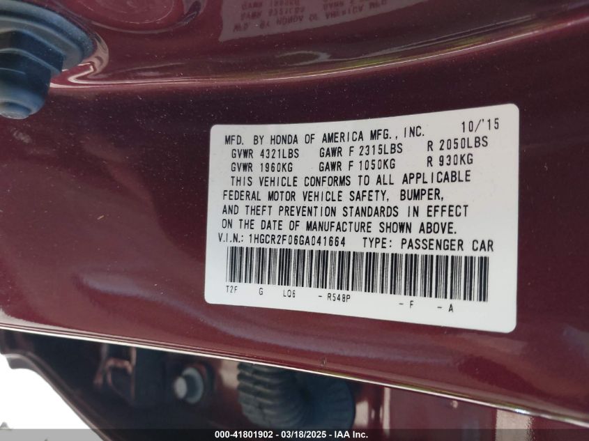 Color BurgundyCylinders 4Drive Front wheel driveVIN 1HGCR2F06GA******State Run & Drive VerifiedDamage Front and back AutoRIA