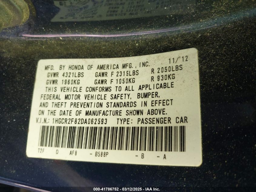 Color BlueCylinders 4Drive Front wheel driveVIN 1HGCR2F82DA******State Run & Drive VerifiedDamage Front or backAuction date 2025-04-02 AutoRIA