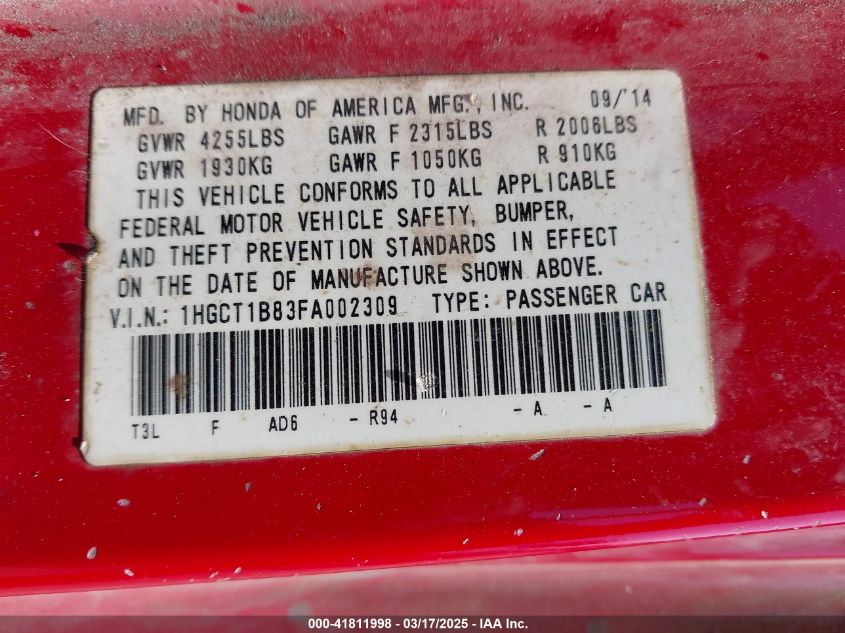 Color RedCylinders 4Drive Front wheel driveVIN 1HGCT1B83FA******State Run & Drive VerifiedDamage Rear left AutoRIA