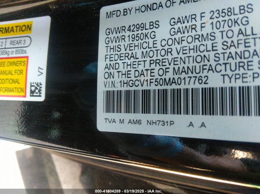 2021 HONDA ACCORD 2021 Gasoline, 1.5, Front wheel drive, VIN - 1HGCV1F50MA****** from the USA