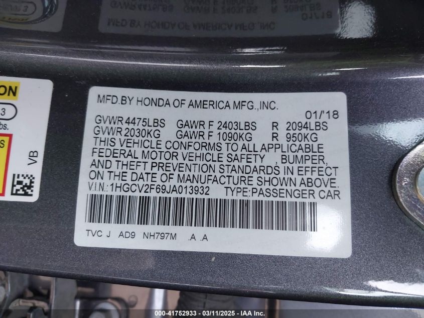 Color GrayCylinders 4Drive Front wheel driveVIN 1HGCV2F69JA******State Run & Drive VerifiedDamage Front and backAuction date 2025-03-20 AutoRIA
