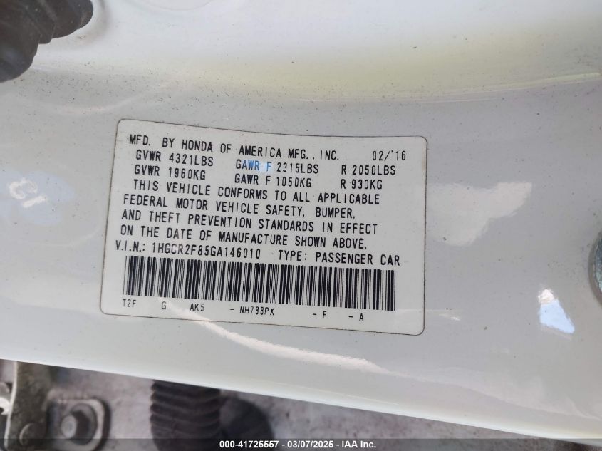 Color WhiteCylinders 4Drive Front wheel driveVIN 1HGCR2F85GA******State Run & Drive VerifiedDamage Front right AutoRIA