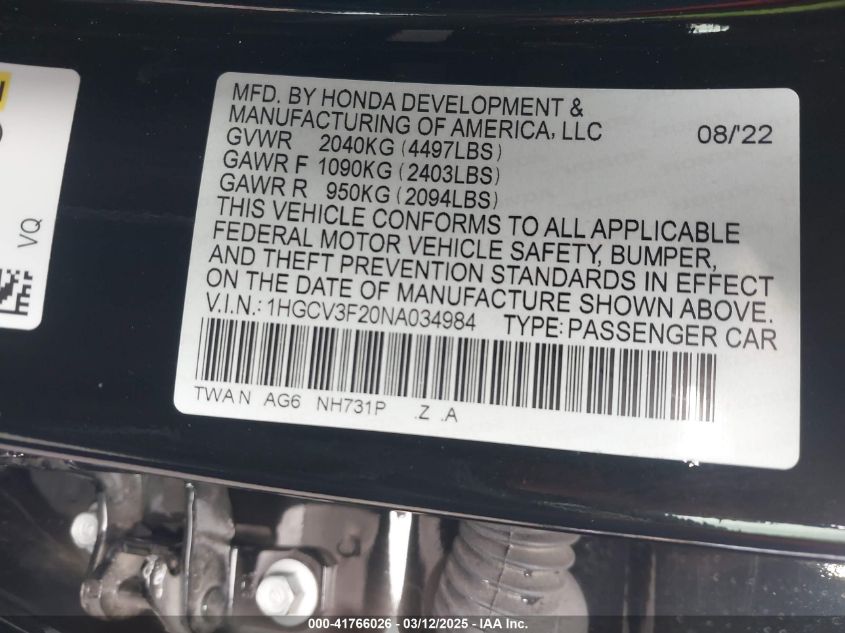 2022 HONDA ACCORD 2022 Hybrid, 2.0, Front wheel drive, VIN - 1HGCV3F20NA****** from the USA
