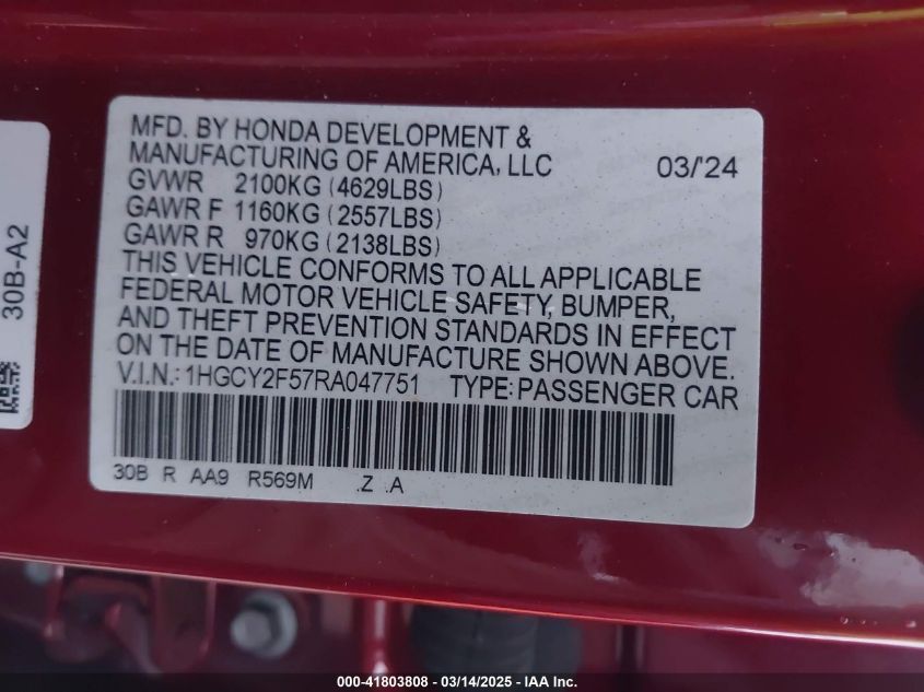 Color RedCylinders 4Drive Front wheel driveVIN 1HGCY2F57RA******State Run & Drive VerifiedDamage Right side