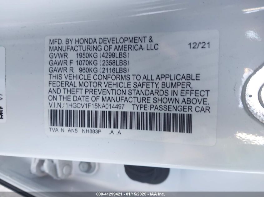 2022 HONDA ACCORD 2022 Gasoline, 1.5, Front wheel drive, VIN - 1HGCV1F15NA****** from the USA